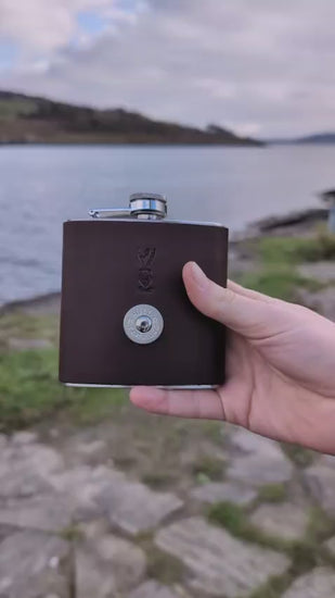 This Shotgun cartridge hip flask with handmade leather cover has been made with care in the J Boult Designs workshop. Each full leather-bound 6oz (177ml) stainless steel hip flask is made with an up-cycled 12 bore shotgun cartridge riveted into vegetable tanned leather. The leather is sourced from the Badalassi Carlo tannery in Italy and is made using a sustainable practice, tanning the leather with extracts of trunk and bark inside wood barrels, greased with a mixture of animal fats and then coloured in a drum.