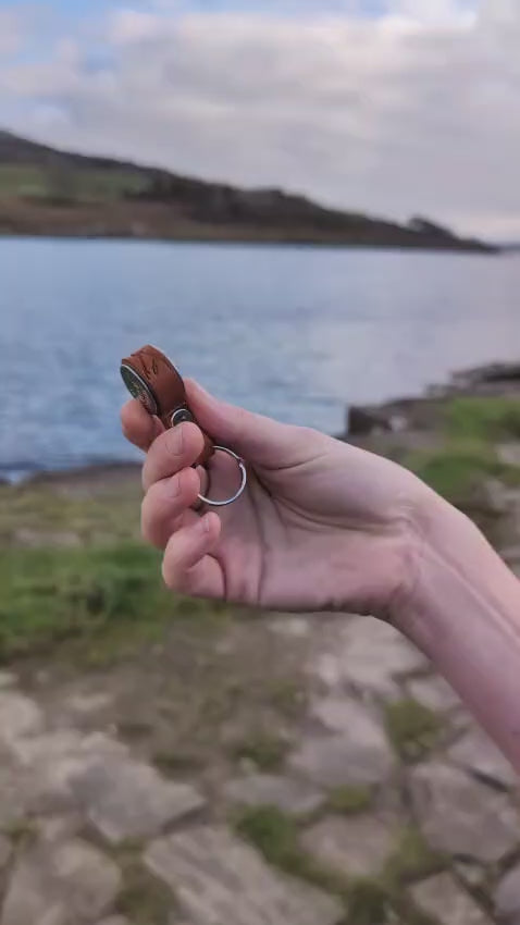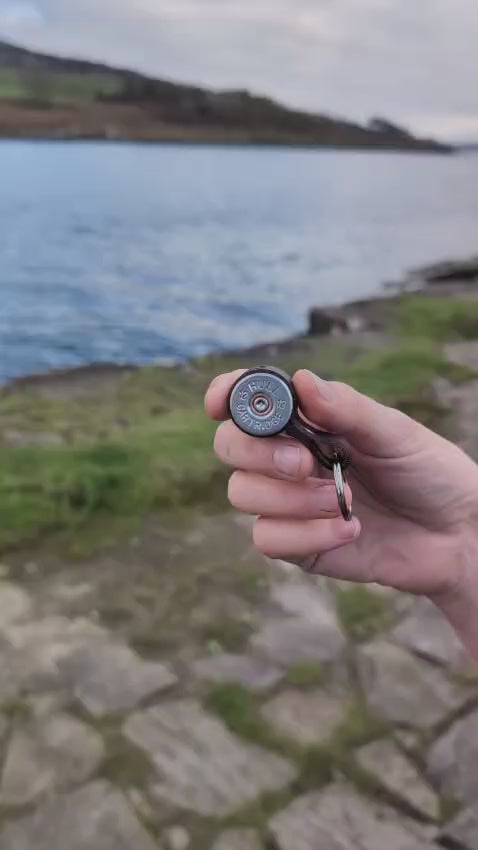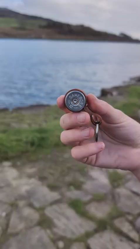 This uniquely designed key ring is handmade from two 12 bore shotgun cartridges wrapped in leather and riveted together to create a neat strong key ring.